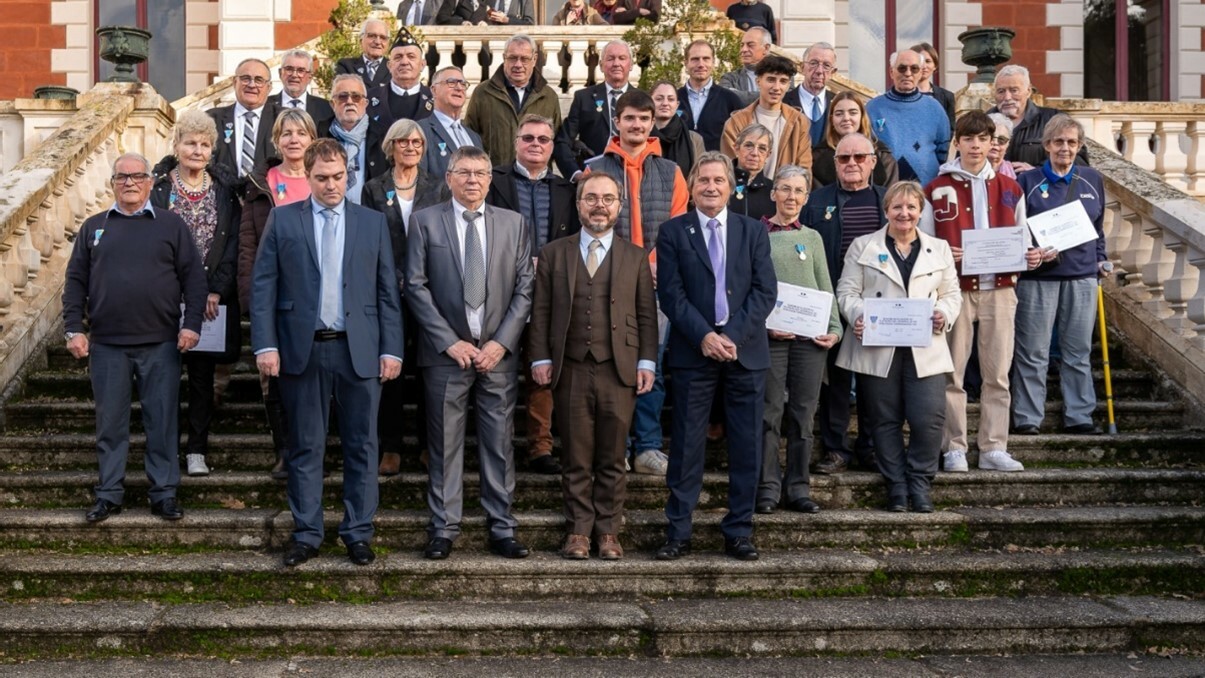 Les récipiendaires « MJSEA » et « Lettres de Félicitations » accompagnés de gauche à droite par Mr Jean-François Teyssandier Président du CDOS, Mr Etienne Desplanques Préfet de la Corrèze, Mr Dominique Lemoine Président MJSEA19, et Mr Damien Marais chef de service du SDJES.